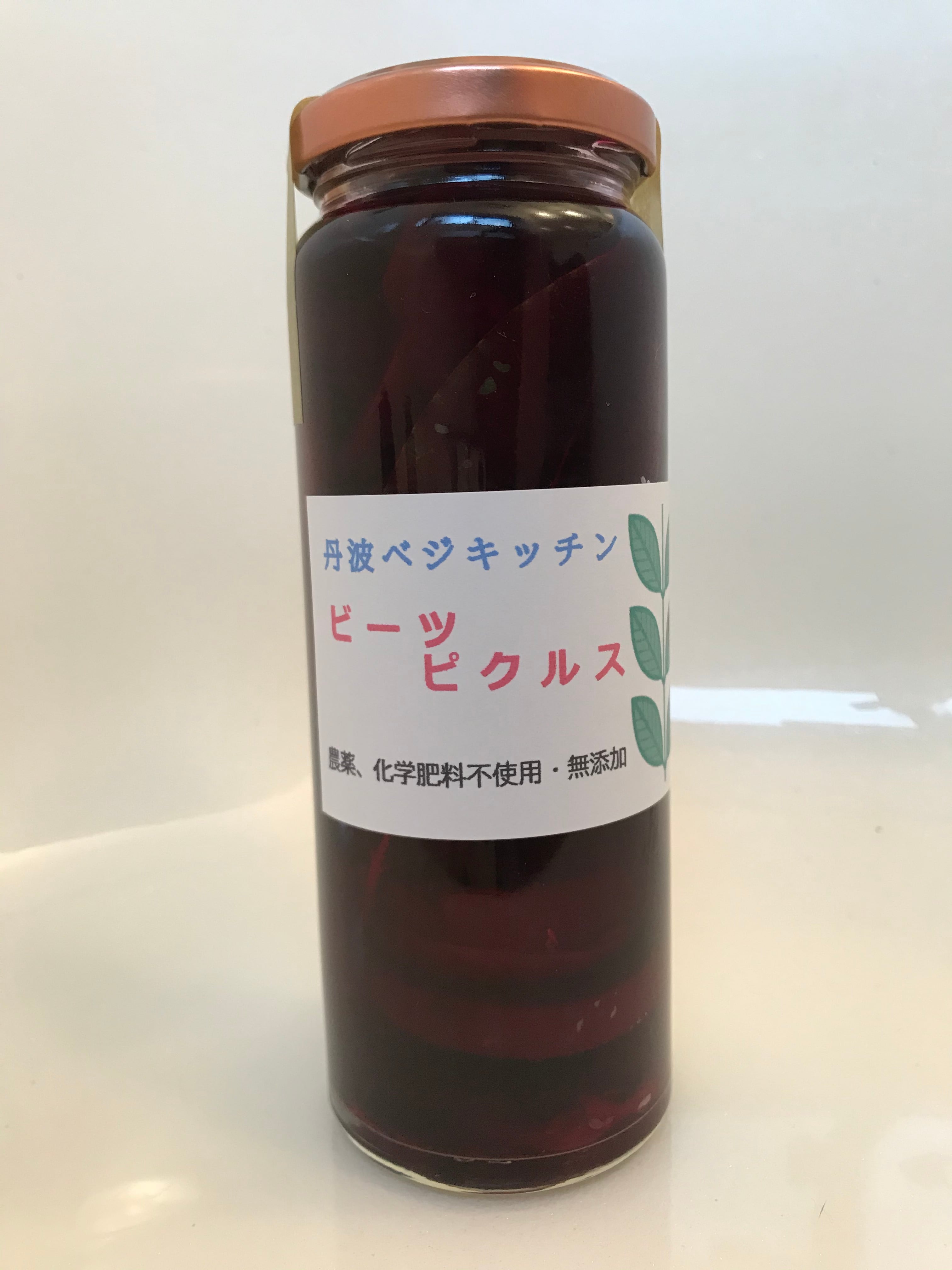 丹波産のビーツを輪切りスライスして、ピクルスにしました。内容量200g(固形料100g)原材料はデトロイト種のビーツ、リンゴ酢、塩、香辛料はローリエを使用しています。無添加。ビーツの色が染み出たピクルス酢は、サラダのドレッシングに使用したり、ゆで卵を漬けて着色を楽しむこともオススメです。また、肉や魚のソテーの最後に回しかけると、コクや照りが出て味も引き立ちますので、無駄なく活用できます。